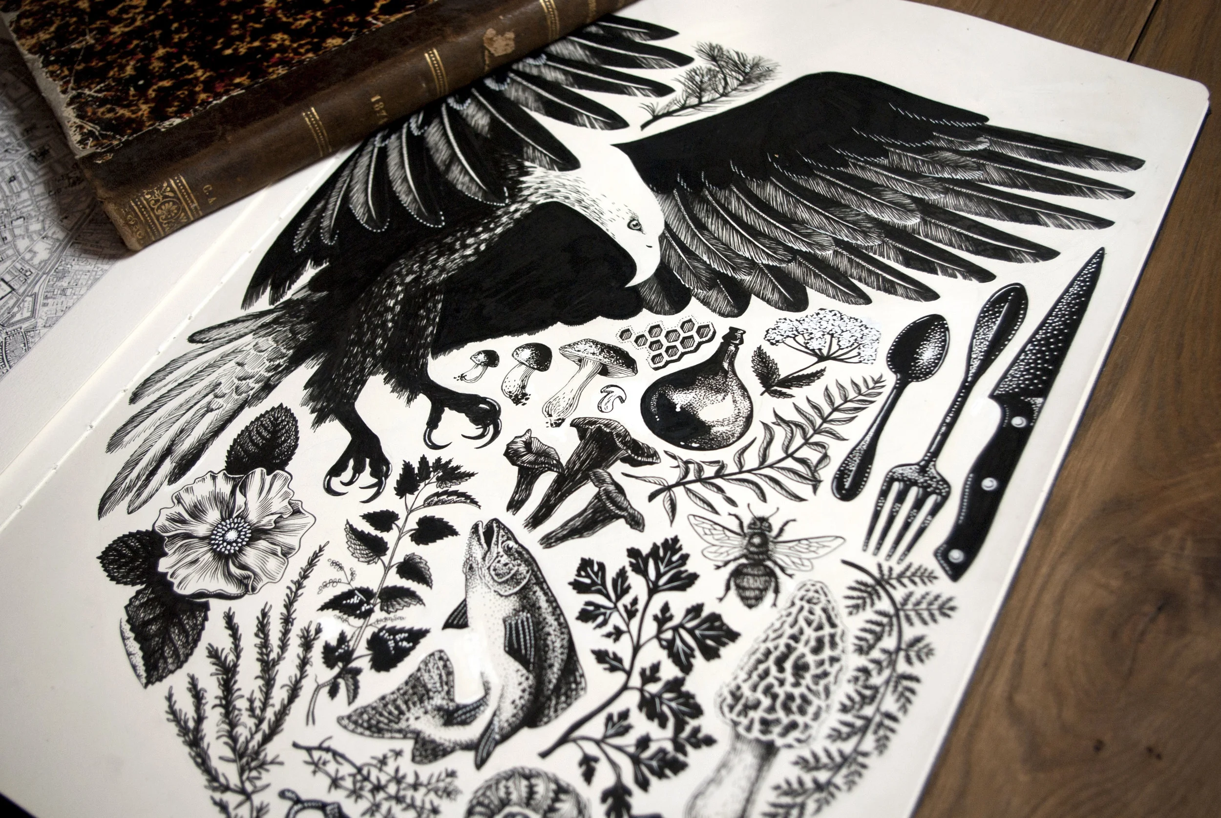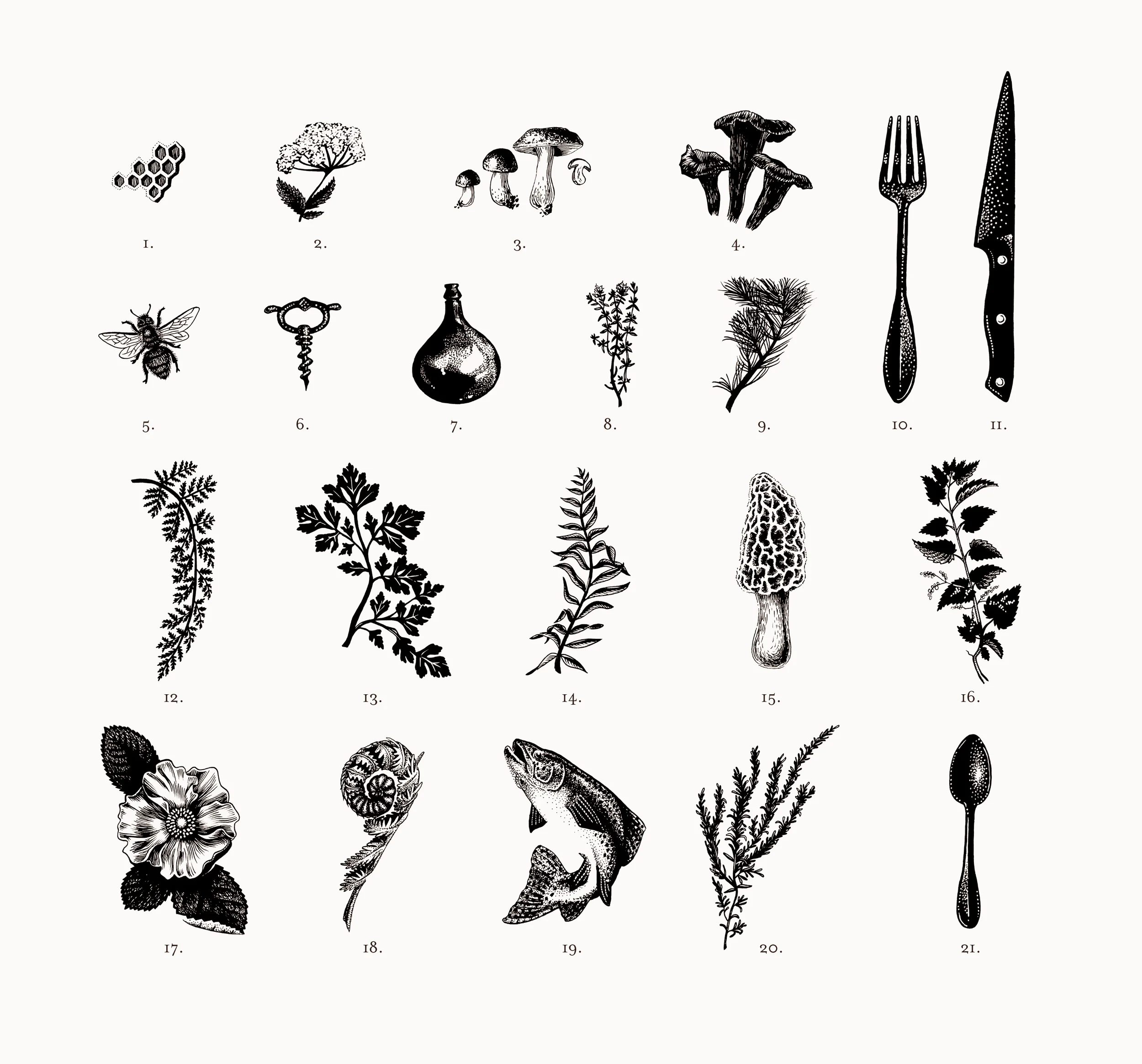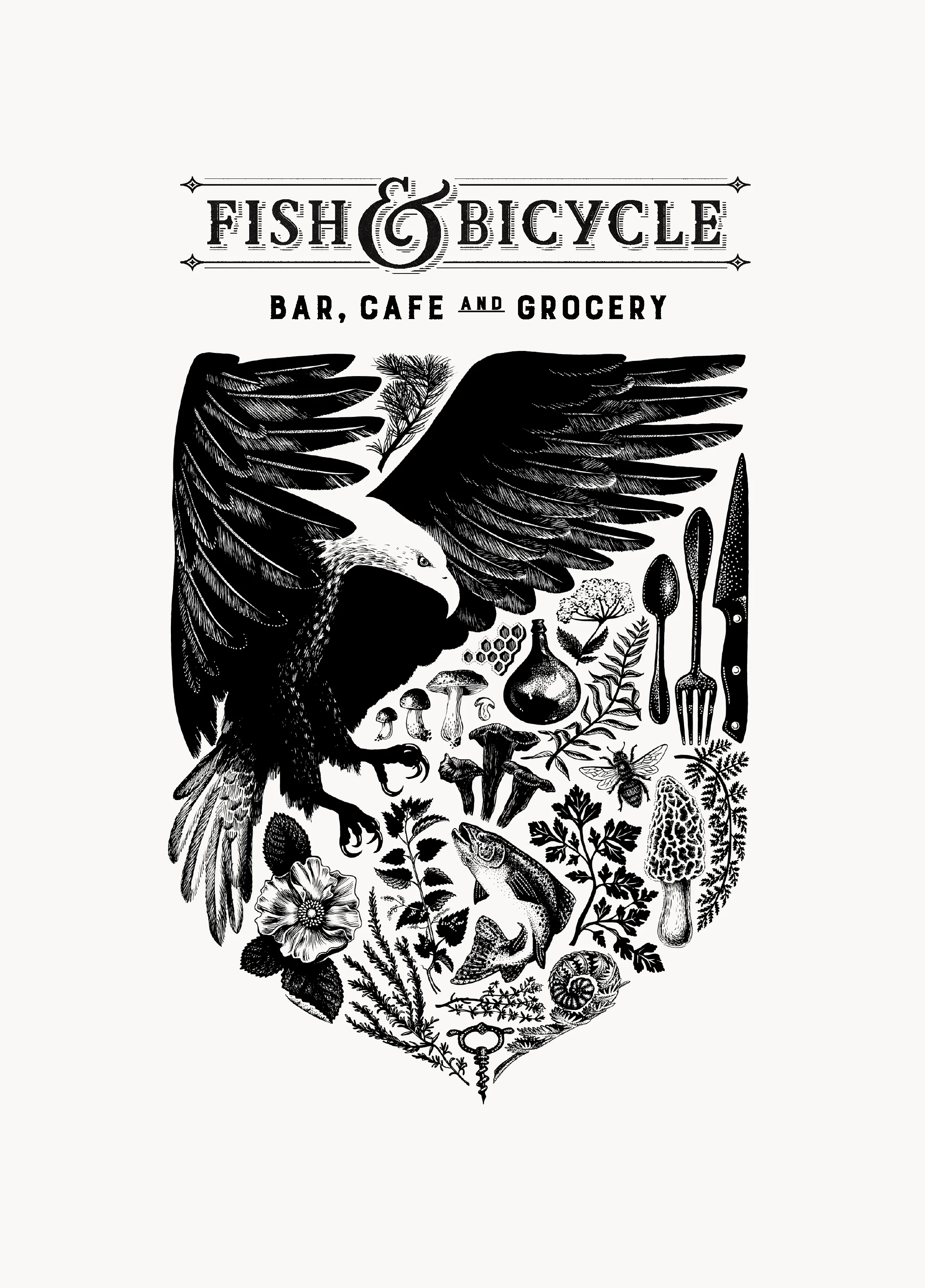Detailed botanic illustrations create a wild heraldic identity for Fish & Bicycle.