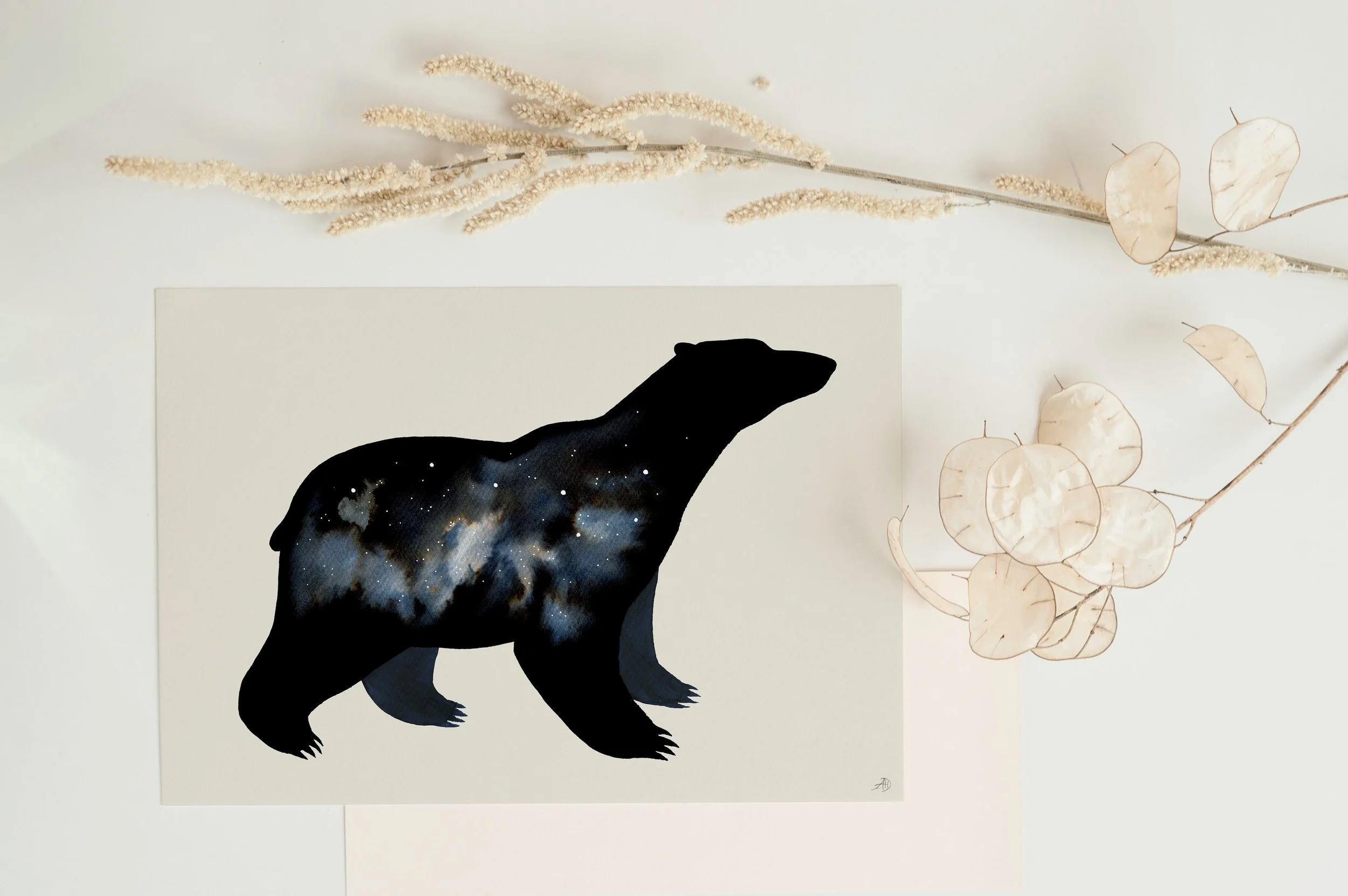 Polar bear, blue whale, narwals, baby seal, snow owl, arctic hare, silver fox, lost cabin, Ursa Major, white forest & the freezing raccoon